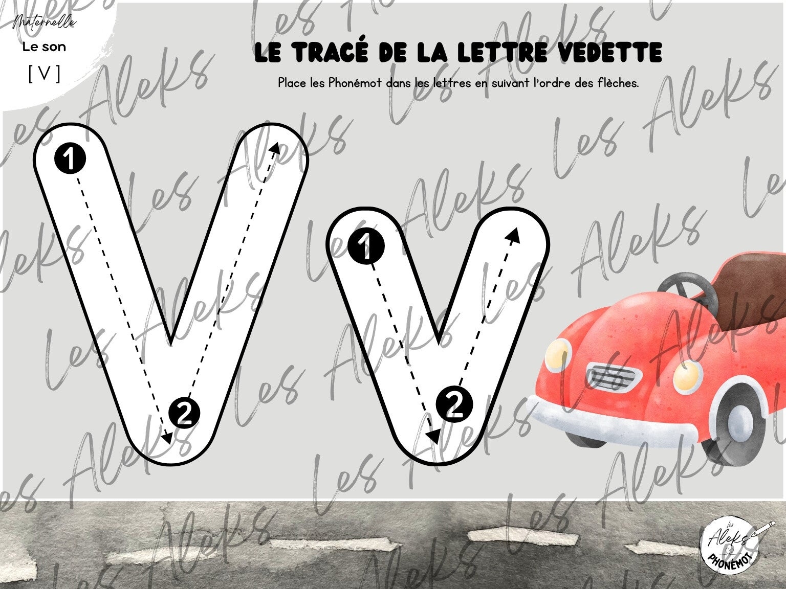 - 1 fiche << Le tracé de la lettre vedette >> permettant d'associer le phonème vedette à son graphème et de travailler la structuration du sens du tracé de la lettre.