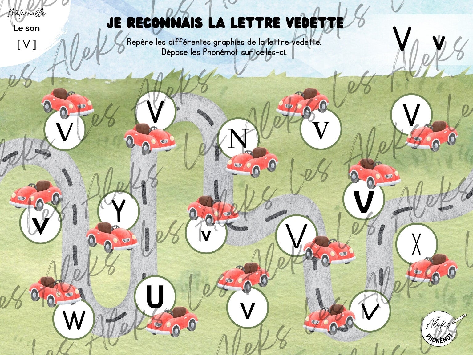 - 1 fiche << Je reconnais la lettre vedette >> permettant de travailler la discrimination visuelle de lettres et la reconnaissance de différentes graphies de la lettre vedette.