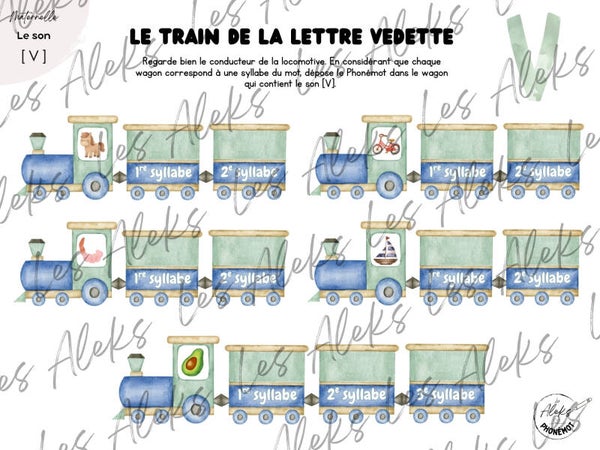 - 1 fiche << Le train de la lettre vedette >> permettant de travailler la segmentation de mots en phonèmes et le repérage de sons dans des mots.