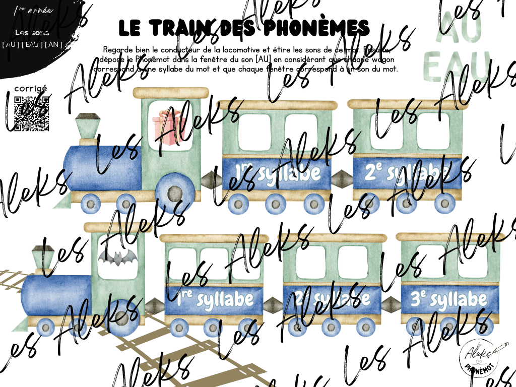 - 2 fiches << Le train des phonèmes >> permettant de travailler la segmentation de mots en phonèmes et le repérage de sons dans des mots.