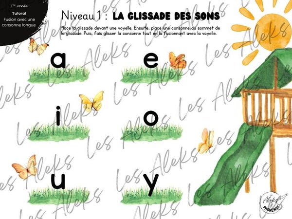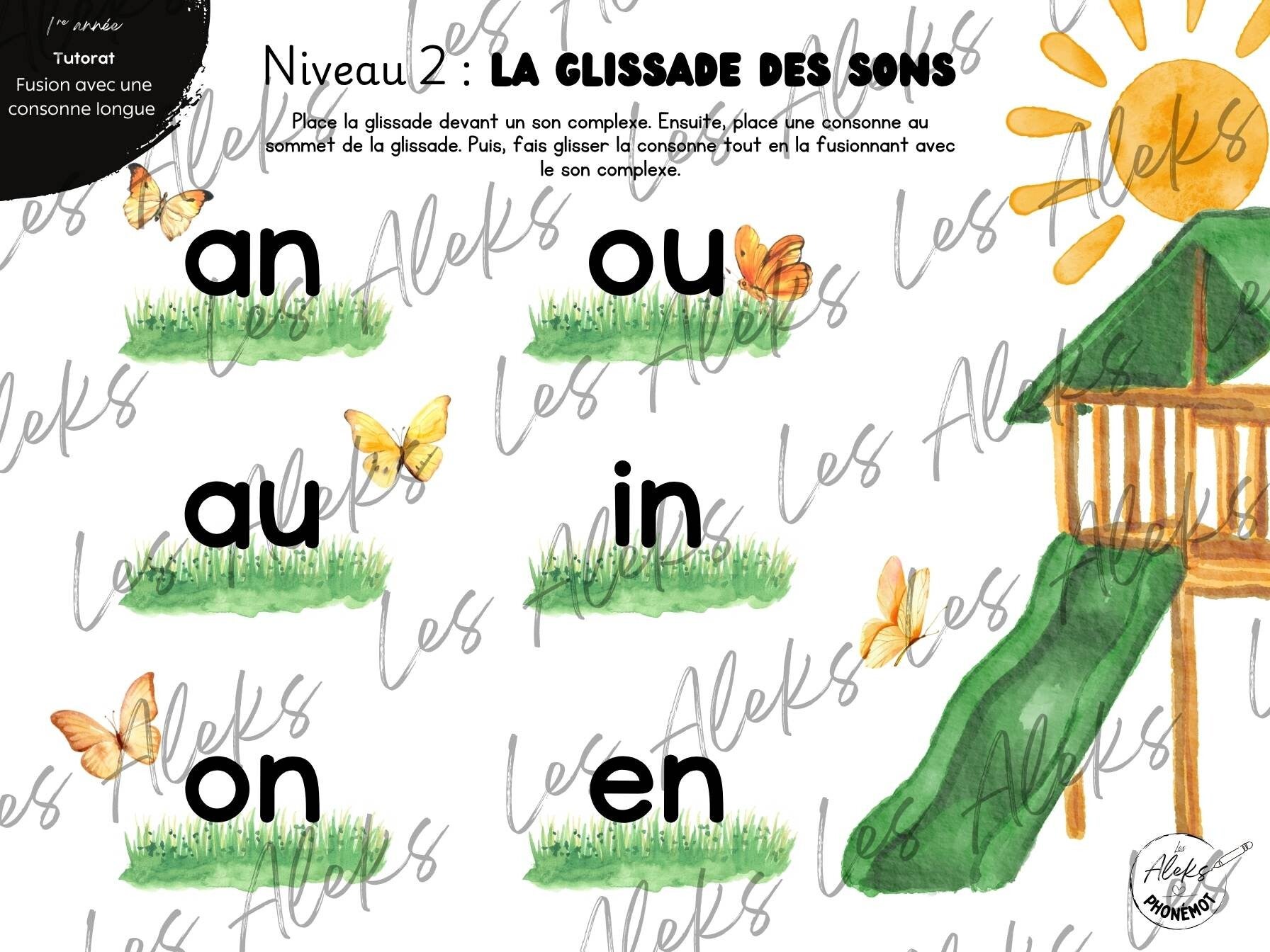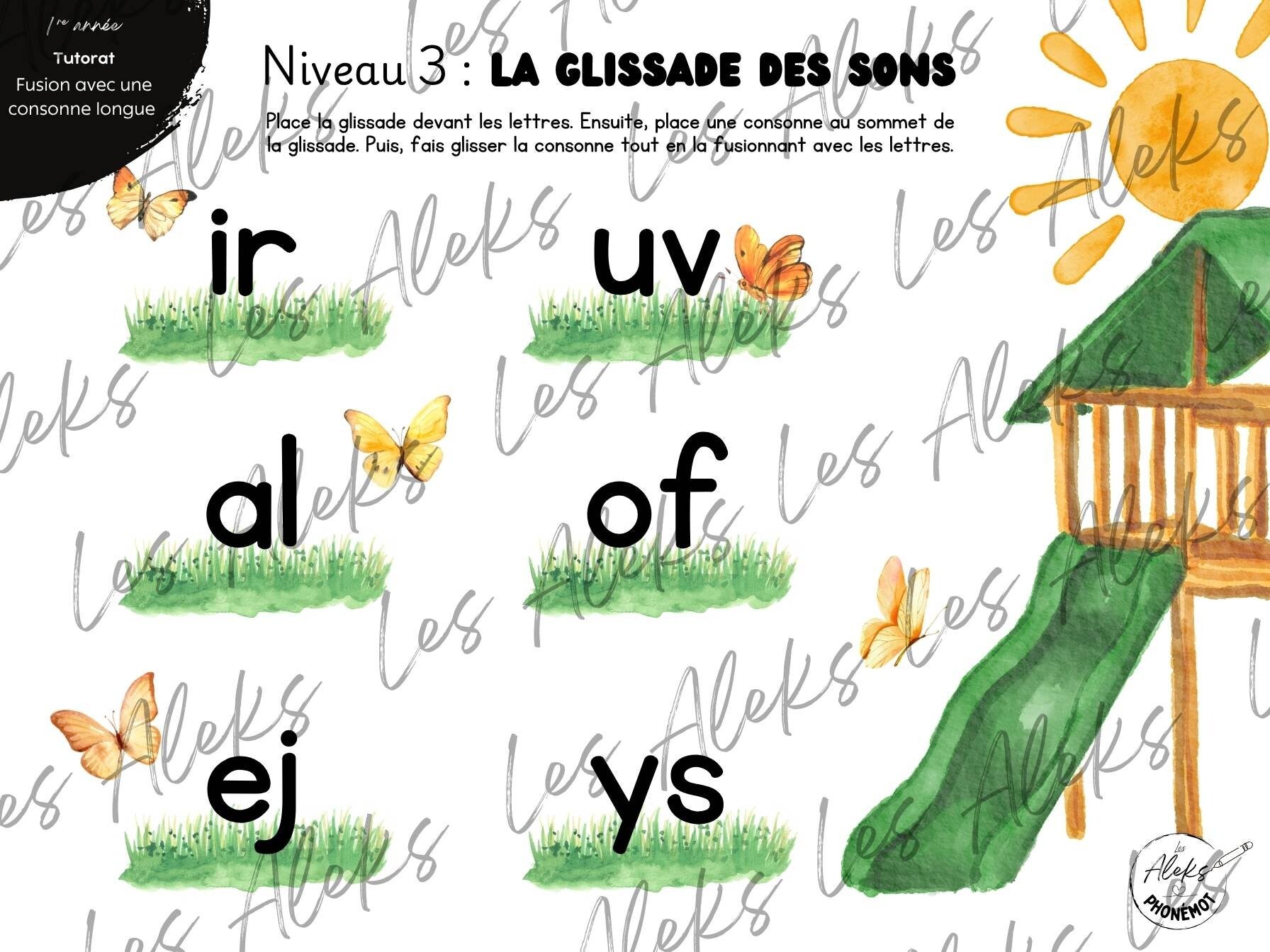- 3 fiches << La glissade des sons >> servant à fusionner les consonnes longues des pastilles avec :
