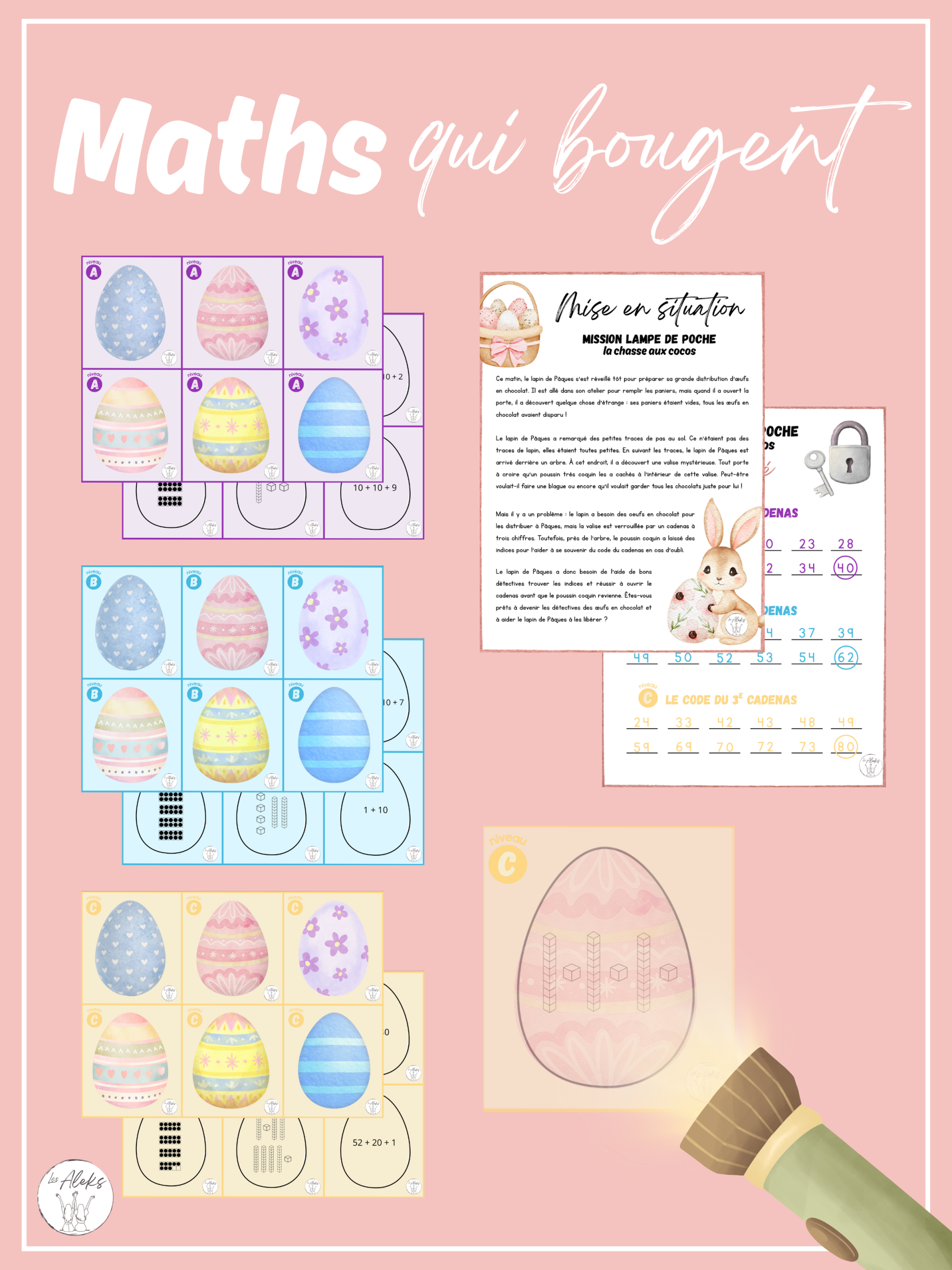 À l'aide d'une lampe de poche, les élèves partent à la recherche de cocos de Pâques cachés dans la classe. En éclairant les cocos, ils découvrent des décompositions de nombres.